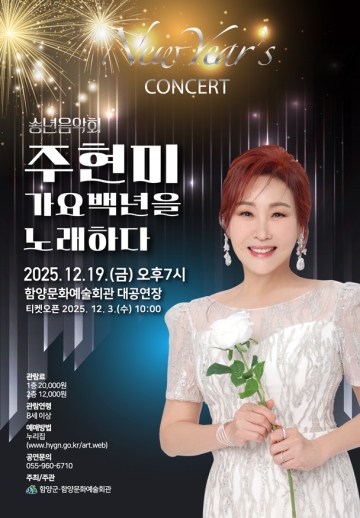 26일, 경남 함양문화예술회관은 2025년 송년음악회 ‘주현미 가요백년을 노래하다!’를 12월 19일 오후 7시 함양문화예술회관 대공연장에서 개최한다고 전했다.
