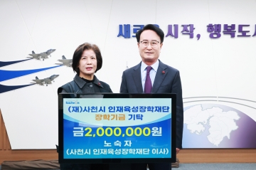 6일 오후, 경남 사천시 인재육성장학재단(이사장 박동식 사천시장) 노숙자 이사는 사천시청 시장실을 방문해 지역 교육 발전과 인재 양성을 위해 사용해 달라며 장학기금 200만 원을 기탁했다.