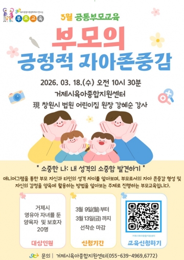 5일, 경남 거제시육아종합지원센터는 부모가 스스로를 존중하고 이해하는 경험이 자녀의 정서 안정과 건강한 성장으로 이어진다는 점에 주목해, 실질적인 도움을 줄 수 있는 부모 교육 프로그램을 지속적으로 운영하고 있으며 관내 영유아 자녀를 둔 부모를 대상으로 ‘2026년 3월 공통 부모교육’참여자를 모집한다고 전했다.