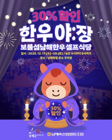 18일, 경남 남해군은 연말을 맞아 12월 17일부터 20일까지 4일간, 매일 오후 5시부터 9시까지 남해축협 본소 주차장에서 ‘한우야:장(보물섬남해한우 셀프식당)’을 운영한다고 밝혔다.