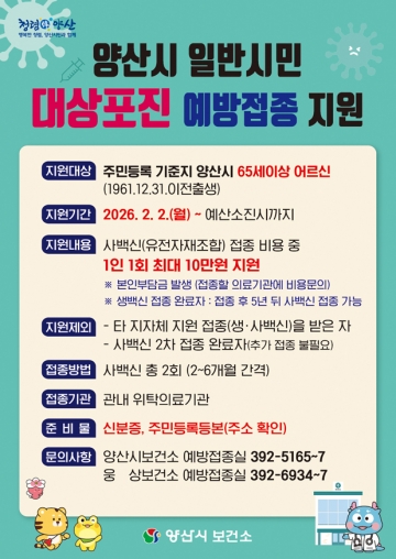 양산시보건소 관계자는 해당 사업 본격 시행을 앞두고 “예방접종은 치료 이전에 시민의 삶을 지키는 가장 효과적인 건강투자”라며 “2026년에는 어르신의 건강한 노후와 임신·출산 가정의 안전을 함께 책임지는 출산·고령친화 건강도시 양산을 만들어 가겠다”고 포부를 밝혔다.