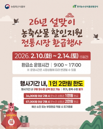 이번 행사는 농림축산식품부가 지원하는 2026년 설맞이 전통시장 소비 촉진 캠페인의 일환으로, 시민이 전통시장에서 국산 농축산물을 구매할 경우 구매 금액의 일부를 온누리상품권으로 환급해주는 방식이다.