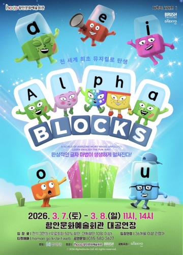 26일, 경남 함안군은 3월 7일부터 8일까지 이틀간 오전 11시, 오후 2시, 모두 4회에 걸쳐 가족뮤지컬 <알파블록스>를 함안문화예술회관 대공연장에서 공연한다고 밝혔다.